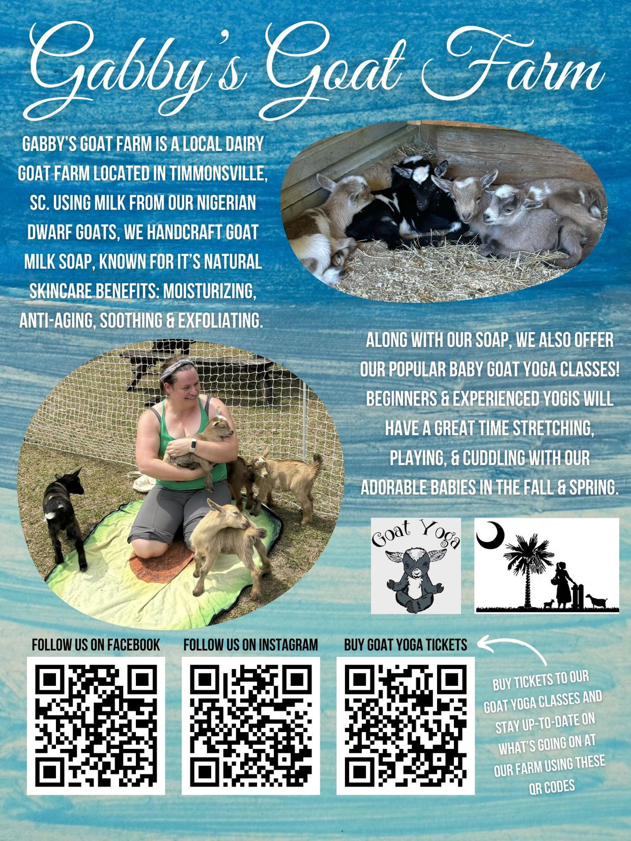 Our farm provides the Pee Dee and neighboring communities with multiple amazing benefits. We have lots of different locations where we host our baby goat yoga, every spring and fall. We also offer private classes, contact us for more info. We sell handmade goat milk soap, at goat yoga classes, at local stores, from the farm and can ship via mail. After every season of goat yoga, we have very social and loving baby goats for sale, both pet quality and beautiful ADGA registered goats. At Gabby's Goat Farm, we want to share our love of goats with everyone.